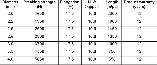 المعلمات التقنية: أسود ، أبيض ، لون شفاف بيضاوي بقطر 1.5 مم -3. 5 مم ، قوة الشد (N) أكثر من 2200 ، 17.5٪ استطالة عند الكسر.
